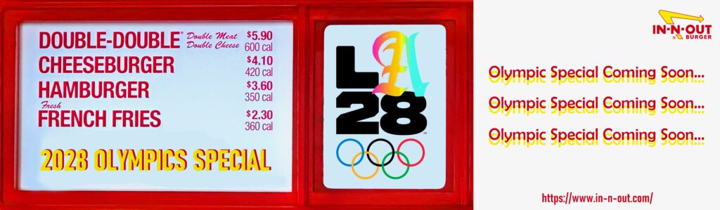 As the 2028 Olympics come home to Los Angeles, In-N-Out Burger is 100% ready to celebrate with something you’ve NEVER seen before. More than our classic, widely-tasted Double-Double and fries, we are proud to announce our 2028 Olympics Special Menu—a limited-time offering designed to fuel your Olympic excitement, of course, in California style.